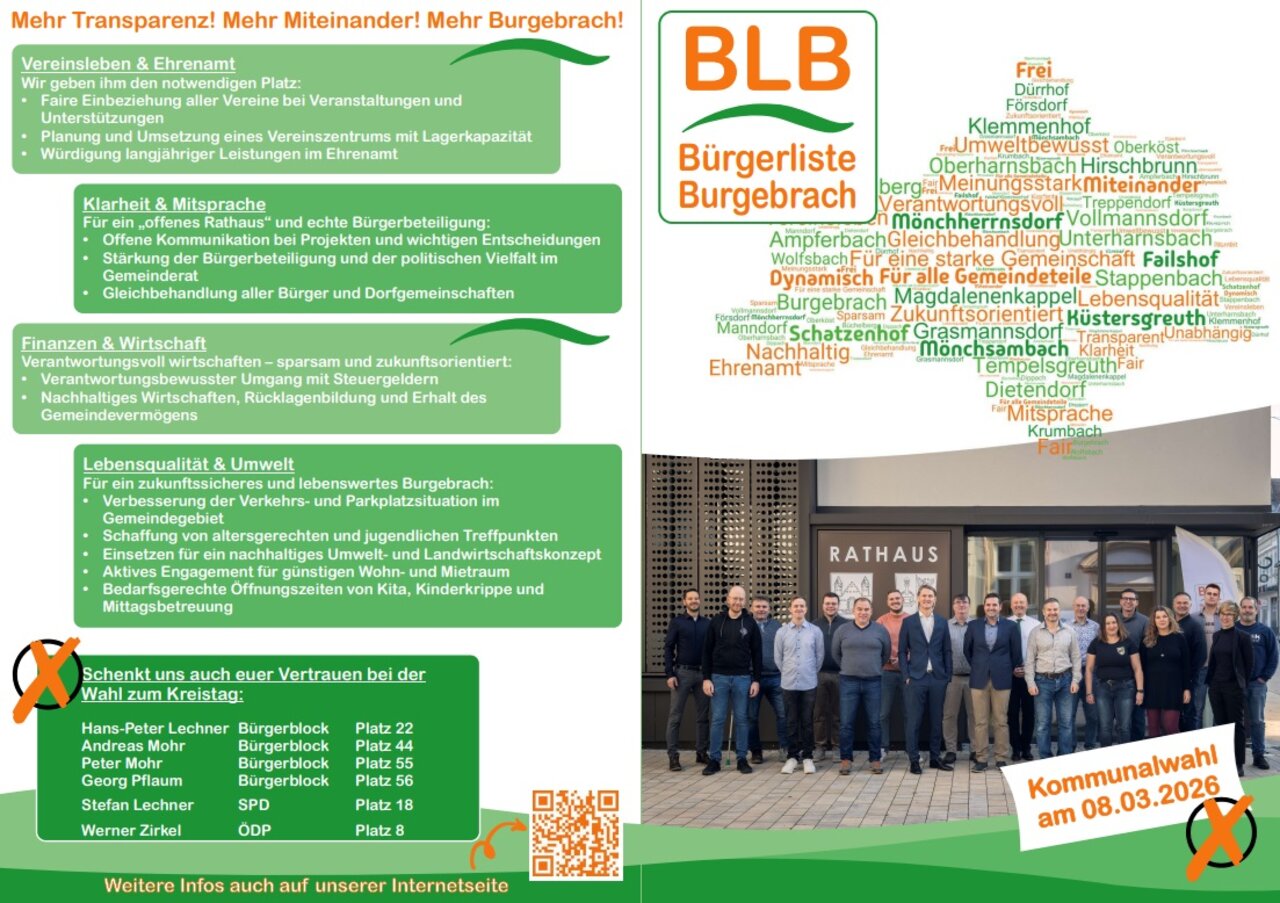 Bis zu den Marktgemeinderatswahlen am 8. März 2026 möchte die Bürgerliste unter anderem beim Burgebracher Weihnachtsmarkt, am Sonntag, 30.11.2025, und bei ihrer Wahlveranstaltung am Samstag, 07.02.2026, im Schützenhaus, im Detail über sich informieren. Alle interessierten Bürger sind herzlich eingeladen.